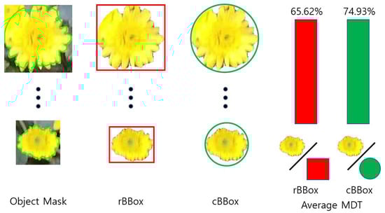The average mask detection ratio (MDT) [] for object detection results was measured to evaluate the efficiency of the cBBox applied in this study. A high mask detection rate means that many object elements to be detected are included in the bounding box. The mask detection ratio was compared by calculating the ratio occupied by each bounding box of chrysanthemum petals in pixel units when the bounding box was selected as a circle or a rectangle from 30 randomly selected object images. Figure 6 shows the MDT calculation and results for rBBox and cBBox. The cBBox has an average MDT of , and the rectangular bounding box has an average MDT of , about higher than the cBBox. This result is expected because the shapes of the chrysanthemum petals are close to circular. The cBBox is more useful in learning because it contains more object characteristics than the rBBox.