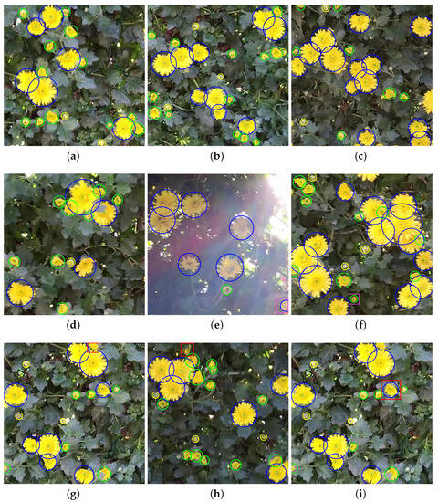 Figure 7 is the test detection result of the proposed network. The cBBox is displayed by classifying colors by class and overlapping them on the image. From the results in Figure 7a–c, flowers with different flowering degrees were detected at the correct location and size, even when the flowers overlap. In the case of Figure 7d, it was confirmed that was well detected, even when leaves covered it among the overlapping flowers at the top of the image. In Figure 7e,f, the part marked with a pink box is the result of over-predicting an object that does not even exist in the truth value of the test data. In the case of Figure 7e, the object is out of the center of the image, and it is difficult to distinguish it from the naked eye under difficult conditions, such as backlighting. In the case of Figure 7f, it is difficult for humans to judge, because the flowers are unclear. Nevertheless, the proposed network can accurately detect objects. Figure 7g,h show the result of not detecting the flowers correctly, and the truth value of the test data is displayed in a red box. Both objects do not have a clear boundary between blooming flowers, and the object is difficult to see because chrysanthemum leaves cover it. Figure 7h is a case where the direction of the flower is distorted and covered by the chrysanthemum leaf, and it is an object shape that does not exist in the training data. Figure 7i shows an example of incorrectly detecting as . The detected object is a case where an error occurs because some flowers are similar to the characteristics of . From the above results, the lack of training data and inaccurate labeling are identified as problems when an object is not detected or detected incorrectly. Therefore, performance improvement is expected if extensive training data and accurate class classification are preceded.