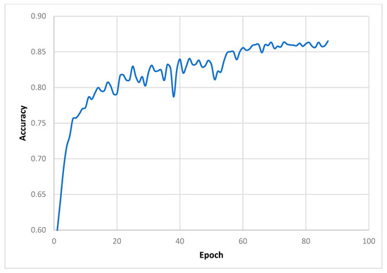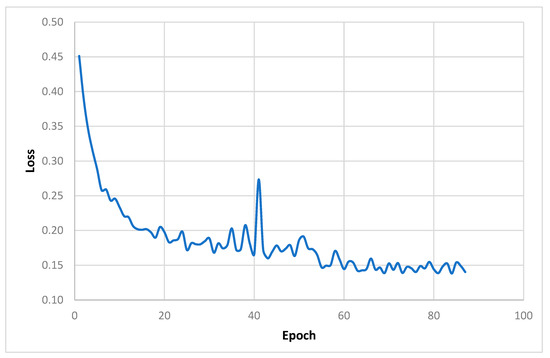 The neural network training was iterative for 87 epochs, after which the error function stopped decreasing and stopped at 0.07 (Figure 1). The accuracy of the borders extraction on the test sample not involved in the training was 86.3% (Figure 2) with the value of the f1 measure equal to 0.924.