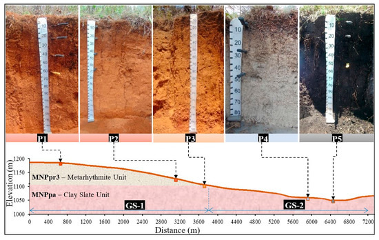 Topographic profile of the toposequence and the relative position of soil profiles. Source: Adapted from Carvalho, Jr. et al., 2022 [24]. (P) soil profile; (GS) geomorphological surface.