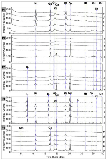 Figure 3 shows the results of the XRD mineralogy analyses, which show that Group 1 soils are essentially composed of kaolinite (Kt), gibbsite (Gb), hematite (Ht), goethite (Gt), and, predominantly, quartz (Qz). Nonetheless, in P3 (Figure 3), small peaks of illite (Il) minerals, with a 2:1 clay–mineral ratio, were detected in the clay fraction, suggesting a slightly lower evolution degree than P1 and P2. We observed more prominent features of Gb in P1 and P2. Novais et al., 2021, 2023, [6,7] found similar results in this study region.