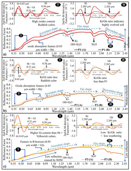Group 1—Morphological Interpretation of the Soil Spectrum: (a) Spectral signatures of P1 horizons highlighting their main features, (b) Spectral signature of P2 horizons highlighting their main features, and (c) Spectral signatures of P3 horizons highlighting their main features. Ellipses in black (I and II) signify enlarged areas analyzed with the Kubelka-Munk second derivative function; (P) soil profile; (A) surface horizon; (B) subsurface horizon; (Kt) kaolinite, (Gb) gibbsite, (Ht) hematite, (Gt) goethite, and (SOM) soil organic matter.