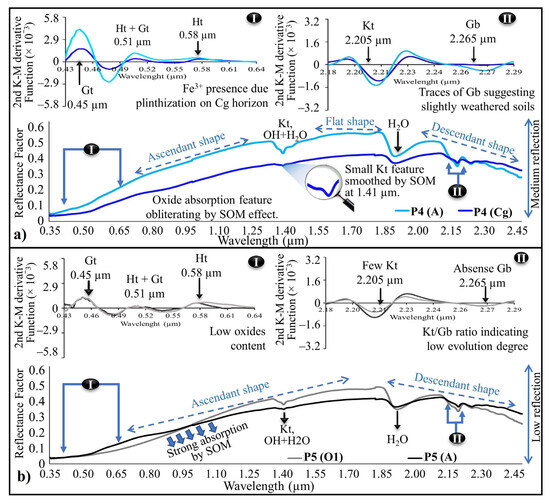 Group 2—Morphological Interpretation of the Soil Spectrum. (a) Spectral signatures of P4 horizons highlighting their main features, and (b) Spectral signatures of P5 horizons highlighting their main features. Ellipses in black (I and II) signify enlarged areas analyzed with the Kubelka-Munk second derivative function; (P) soil profile; (A) surface A horizon of Gleysol; (Cg) subsurface horizon of Gleysol; (O1) surface organic horizon of Histosol; (Kt) kaolinite, (Gb) gibbsite, (Ht) hematite, (Gt) goethite, and (SOM) soil organic matter.