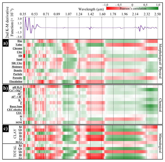 Pearson’s correlation between Vis-NIR-SWIR wavelengths under Kubelka–Munk function and (a) morphological and physical soil attributes, (b) chemical soil attributes, and (c) mineralogical composition in clay and total treatments: (CEC) cation exchangeable capacity; (V) base saturation; (SOM) soil organic matter; (Kt) kaolinite; (Gb) gibbsite; (Ht) hematite; (Gt) goethite; (Qz) quartz; (IL) illite; and (Sm) smectite.