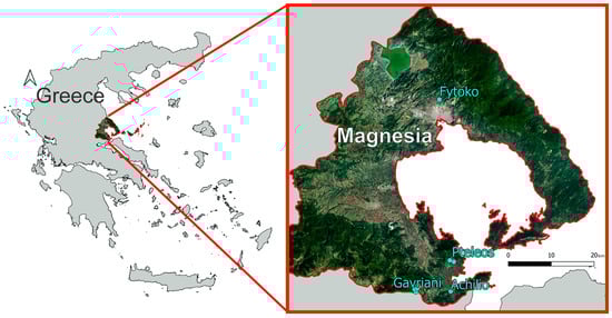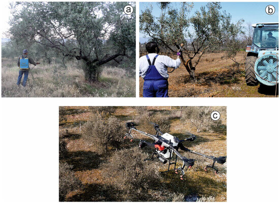 Three alternative methods for olive fruit fly bait control were examined: (1) spraying applied by a workshop comprising of a group of workers carrying backpack sprayers, (2) spraying with a tractor-mounted sprayer and a second worker walking by foot and operating a spray lance connected to a hose, and (3) a novel spraying method with a UAV (Figure 1). The cases were examined in the province of Magnesia, Greece, a region with extended olive production (Figure 2).