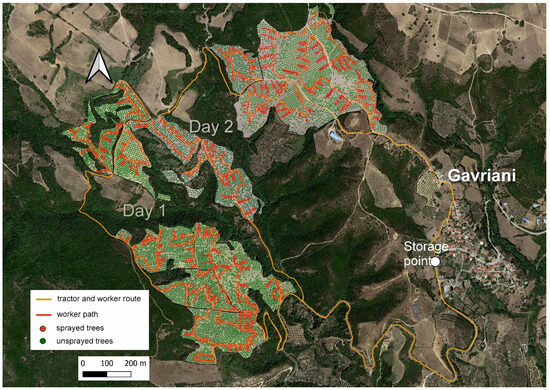 This method is employed in hard to access areas where wheeled machinery cannot enter the terrain. The workshop usually comprises of four to six spray workers, one foreman, and one driver who carries the material and occasionally the workers from place to place. The majority of workers use manually operated sprayers even though some electric devices are now common. The workshop is responsible for an area of 80–150 ha by spraying one third of the trees during a period of four to six days. The workers start from one common point, scatter to perform the spraying and then gather again in another point to refill the spray tanks and continue their work. Each worker applies around 300 mL of spray on selected trees (depending on their size) with medium size droplets of about 500 μm. One worker carrying an 18 L backpack sprayer is expected to spray around 60 trees (and protect around 180 trees) until needing to refill their sprayer. Two such workshops were monitored during two complete working days. The first operated in the region of Achilio, Magnesia, Greece (39.998407° N, 22.959181° E) and comprised five spray workers, one foreman, and one driver and the second in the region of Pteleos, Magnesia, Greece (39.060232° N, 22.957723° E) comprising four spray workers, one foreman, and one driver. All the workers and the tractor drivers were provided with hand-held GNSS devices to control their paths and working times. Detailed data over two consequent spray tank refillings were recorded by inspecting the workshops during their work (Supplementary Material Table S1). The number of sprayed trees, the time of pure work minus the time for breaks, refilling, and moving from one spot to another were also recorded. The area covered and the total number of trees were counted using QGIS software (QGIS Geographic Information System, QGIS Association. http://www.qgis.org, accessed on 23 September 2023) using a Google satellite hybrid XYZ tile (Figure 3). The trees were planted on random schemes and the density was 158 trees per ha in Achilio and 128 trees per ha in Pteleos. As such, six to seven areas are covered by each workshop during their daily work that starts at dawn and terminates around 11:00 to 12:00 pm before the temperature rises too high.