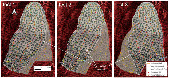 Consequently, tests with three actual spraying missions were performed following alternative paths until the tank become empty and/or the battery needed replacing (Figure 5). The number of sprayed trees in each case was recorded along with other spraying parameters like spray doses, partial times, and area (Supplementary Material Table S4).