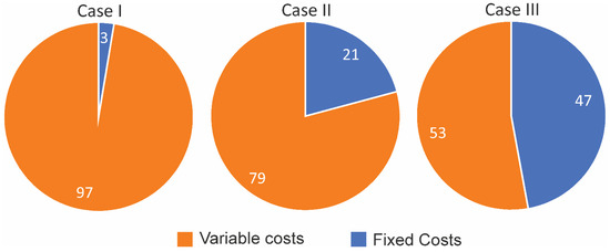 Figure 6 presents the distribution of the variable and fixed costs for the three methods. The variable costs include labor, energy use, and repairs and maintenance. They are accounted for on an hourly basis and occur only when a task is performed. Fixed costs, on the other hand, are accounted for on an annual basis and occur even if an item is not in use. They include capital spending, license, fees and taxes, storage, and field surveillance (only for Case III). Variable costs are considered flexible but fixed costs are rigid. To eliminate the contribution of the fixed costs to the total costs, the annual use of the items should be at its maximum. The present study is based on such a precondition. The analysis indicated that for the traditional method of backpack spraying (Case I), the contribution of the fixed costs was only 3%. In Case II (spraying with a tractor-mounted sprayer and a ground worker), the fixed costs became higher and represented 21% of the total. In the novel UAV method (Case III) however, the fixed costs represented almost half of the total.