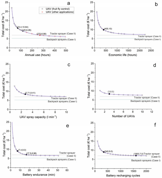 For annual use (Figure 7a), the nominal value estimated in the present study for covering one workshop sector during the whole fruit fly control period was 120 h and, as discussed, could be expanded to 270 h by involving the UAV in other applications. But if the annual use falls below 73.4 h, the total cost will start to rise too abruptly, making the method too expensive. Similarly, in Figure 7b, the economic life of the UAV should be at least 400 h to avoid an abrupt increase in the operational cost. The critical value for the UAV total spray capacity is 2.71 L min−1 (Figure 7c, in the current study it was 3.60 L min−1), while at least three UAVs should be operational for each backup UAV (Figure 7d). Concerning the batteries, their endurance need to be greater than 7.4 min (Figure 7e) while providing at least 340 recharging cycles (Figure 7f).