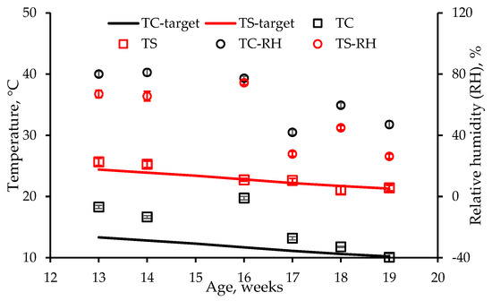 A data logger (Make: Tinytag Ultra; Model: TGU-1500; Accuracy: ±0.2 °C; Range: 0 to 70 °C) was placed in each chamber to measure and log temperature and relative humidity (RH) every 15 min during the confinement period. Since measured temperatures were similar among the four chambers, as indicated by low standard deviations (SD), they were averaged for each week (Figure 2). Average weekly measured and target TS temperatures were within ±2 °C. However, in the TC regime, higher measured temperatures in all weeks except week 19 (Figure 2) were due to the inability of the A/C unit used to cool the enclosure despite the study being conducted in the morning during the cool season. Relative humidity in both temperature regimes ranged from 60 to 85% during weeks 13 and 14 of age due to warm, humid ambient conditions. From weeks 17 through to 19 of age, RH ranged from 30 to 60% due to cooler and drier conditions (Figure 2).