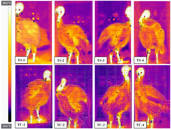 Infrared images of 18-week toms, when measured chamber temperatures at both temperature regimes were close to the target temperatures, are shown in Figure 4. The IR image of a specific body section (e.g., head) was used to calculate the average temperature for that section. In the torso section, feathers not in contact with the body (e.g., TC-4, Figure 4) appeared cool and reduced average section temperature. The featherless head and leg sections were warmer than the torso. The TS birds appeared warmer than the TC birds.