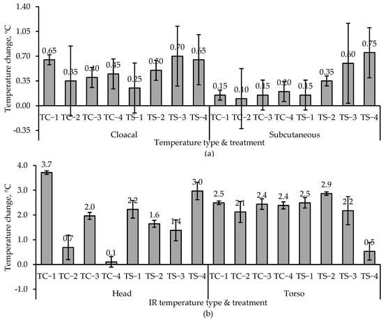 Mean change (n = 2) in the cloacal, subcutaneous, average head, and average torso temperatures for the 18-week toms over 2 h of exposure in the chamber are compared in Figure 5. Data for other weeks are in [18]. Temperature rise had been expected to decrease (or even reverse) with increased airflow rate at the same chamber temperature. However, this trend was only fully evident for subcutaneous temperature in the TS temperature regime and, to a lesser extent, for subcutaneous temperature in the TC regime and cloacal temperatures in both TC and TS regimes (Figure 5a). As expected, the subcutaneous temperature increase was generally higher in TS (vs. TC) and inversely correlated with airflow rate. Head and torso surface temperatures seemed to be unaffected by either airflow rate or chamber temperature (TC vs. TS) (Figure 5b). In chamber studies, subcutaneous temperature appears to be more reliable for monitoring short-term heat stress.
