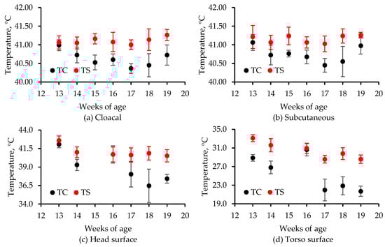 Plots of the mean (a) cloacal, (b) subcutaneous, (c) average head surface, and (d) average torso temperatures over the 7-week study after 2 h of exposure. The temperatures for each week were obtained by averaging the final values for the four airflow rates and two replicates (n = 8), except for (c,d) for weeks 16 and 19 of age for TC when n = 6. Infrared temperatures (c,d) were lost for week 15 of age. The error bars represent ± one standard deviation.