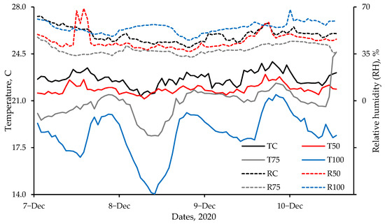Hourly average (n = 12) temperature and relative humidity (RH) trends in the four treatments, beginning the afternoon of 7 December 2020. Lines (instead of markers) are used to demonstrate the trends. In the legend, the first alphabet T (or R) represents temperature (or RH). The remainder of the legend represents the ventilation rate as: C—Control, 50—VR−50, 75—VR−75, and 100—VR−100. Earlier data were discarded. The target room temperature was 20.5 °C.