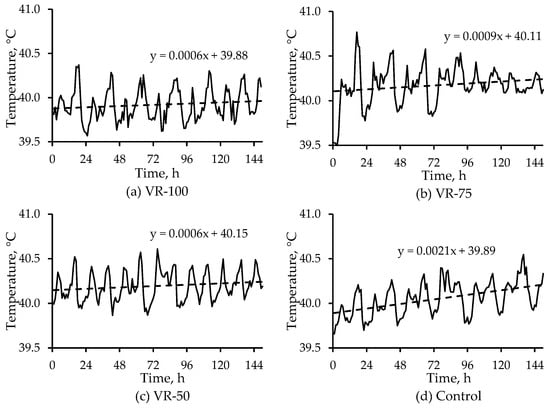 Average (n = 3) hourly subcutaneous temperature trends in 20-week tom turkeys in the four treatments ((a) VR-100, (b) VR-75, (c) VR-50, and (d) Control) in the 6 d room study. Lines (instead of markers) are used to demonstrate the trends more clearly. Temperatures were measured every 15 min and averaged every hour. The dashed line represents the linear fit.