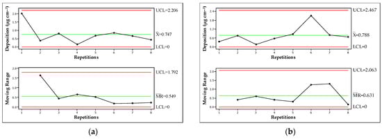 Additionally, to assess the quality of spray deposition, from a statistical process control point of view, within each plot and ensure that it was within the acceptable variability, control charts were created using the statistical process control methodology [25]. The analysis was conducted for the upper and lower portions of the plant.