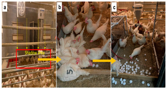 Experimental room showing (a) shadows from equipment that cause a dark area, (b) floor egg-laying behavior of hens, and (c) mislaid eggs on the floor litter in a darker area.
