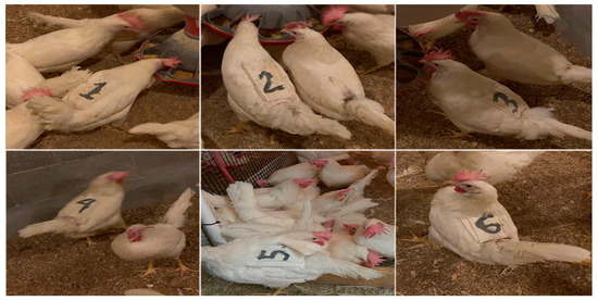 Floor egg-laying behavior is the primary cause of mislaid eggs. To better understand this behavior, a study was conducted where 6 focal hens performing FELB were randomly selected from each room. These focal hens were given lightweight harnesses (8.4 g; made by our researcher) three days before the study began to make them accustomed to wearing them. Each harness was labeled 1–6 to help identify the individual hens (Figure 4). The FELB of these focal hens was recorded 24 h a day from 27 to 30 weeks of age using six cameras attached to the ceiling of each room to capture an overview of the entire space. After the research was completed, videos recorded during daylight hours (16 h, from 5 a.m. to 9 p.m.) were analyzed in detail to differentiate between focal hens that were laying eggs on the floor (recorded as “0”) and those that were inside the nest boxes or not performing FELB (recorded as “1”). A duration of 5 min was selected to conduct this study, as previous research had indicated that focal hens typically spend at least 5 min during nest-laying behavior [13]. Therefore, if the focal hens remained inside the nest boxes or were not seen performing FELB for more than 5 min, they were recorded as “1”; otherwise, they were recorded as “0”. This distinction was made based on close observation of the recorded videos taken daily; however, one day of the video was randomly selected each week for analysis. Similarly, the video recordings were observed closely to determine the total time spent by each focal hen performing FELB on the floor.
