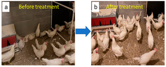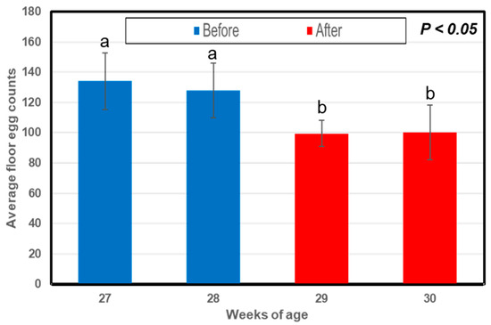 Average floor egg counts before and after treatment every week in a cage-free hen house (170 hens). The letters that differ are statistically significant at p < 0.05. The error bar represents the standard deviation.