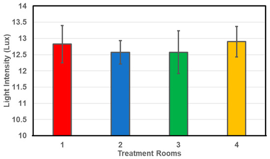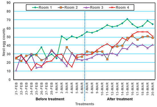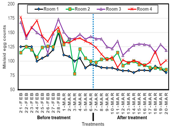 The cage-free housing system consists of equipment attached to the ceiling, such as a heater, fan, feeder, and perches, that can block light and cause dark areas. This study found that the heater and circulating fan cause dark areas (low light intensity places compared to other places within the room). That is why we introduced additional light as treatment in those places in each room to maintain uniformity of light intensity. Since the mislaid egg counts varied significantly between the rooms before the treatment started (Figure 3), this study uses the before (without the addition of additional lighting in darker areas) and after treatment (addition of additional lighting in darker areas for uniform room lighting) concept. Data collection was conducted for 4 weeks (the first 2 weeks before treatment and the following 2 weeks after treatment) in each room.