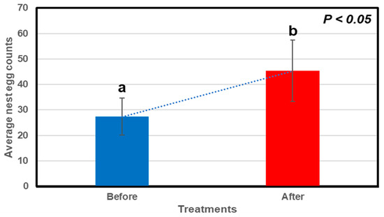 Average nest egg count before and after increasing light intensity. The letters that differ are statistically significant at p < 0.05. The error bar represents the standard deviation.
