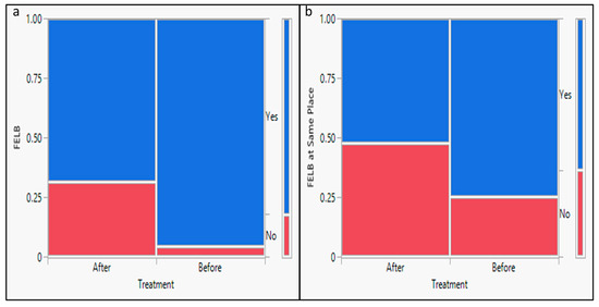 Mosaic plot showing the relationship between (a) FELB categorized as “Yes” for hens engaging in FELB or “No” for hens not involved in FELB and (b) FELB at the same location categorized as “Yes” for hens performing FELB in the expected location or “No” for hens performing FELB in a different location. FELB: floor egg-laying behavior.