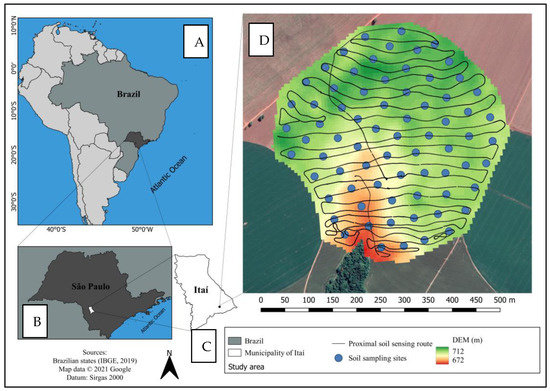 (A) Map of Brazil in Latin America; (B) contour of the state of São Paulo; (C) contour of the municipality of Itaí; (D) map of the study area with a digital elevation model in the background, the vehicle route equipped with proximal soil sensors (PSSs), and points collected for analysis in a laboratory.