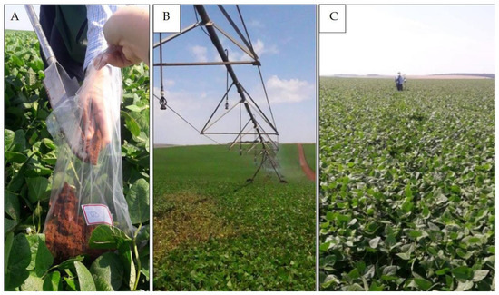 (A) Soil sampling at 0–10 cm using a Dutch auger; (B) study area in September 2019 with irrigated beans; (C) view of the study area showing the bean plantation.