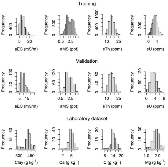 The distribution pattern of the aEC and aMS attributes and laboratory data could be classified as platykurtic, corresponding to a flatter distribution than the normal curve of the same area, except for aEC for the leptokurtic training dataset. Despite the asymmetry and kurtosis values of the aEC data, it was impossible to consider a normal distribution, and therefore, for mapping via OK, it was necessary to transform the data to fit the normal distribution using natural logarithmic distribution. The other attributes of the PSS (aMS, eTh, and eU) and the separate data for external validation showed a normal distribution. The distribution pattern of the values for all data sensors (the training and validation dataset) and laboratory datasets is shown in Figure 4.