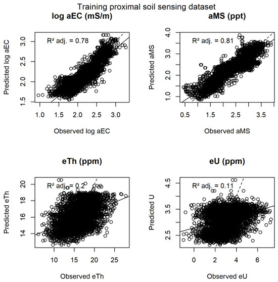 Predicted versus experimental plots of proximal sensor data as a function of remote sensor data using the training dataset. The continuous black lines adjust the intercept and slope for the models, while the dashed lines are the intercept and model idealized as 1 and 0, respectively. R2 adj.: R2 adjusted value; aEC: apparent electrical conductivity in mS/m (millisiemens per meter); aMS: apparent magnetic susceptibility in ppt (parts per thousand); eTh: equivalent thorium in ppm (parts per million); eU: equivalent uranium in ppm (parts per million).