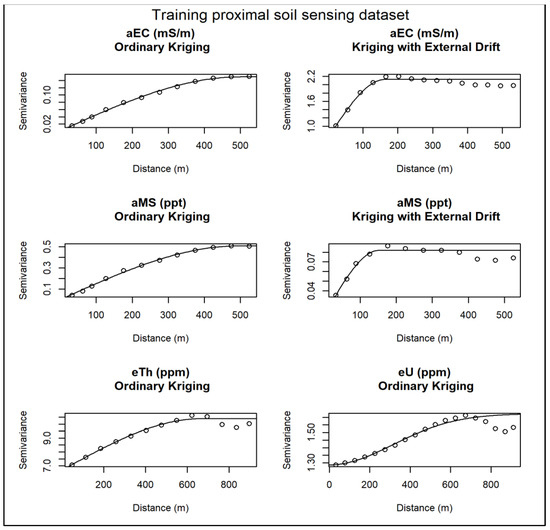 Semivariograms were adjusted by removing the RS covariates’ trend, as shown in Figure 6. The parameters used in the PSS semivariograms to map using OK and KED are shown in Table 4. All attributes of the aEC, aMS, and eTh data were adjusted for the spherical model (Figure 6), while the sensor eU was better adapted for the Gaussian model (Figure 6). The low values of the nugget parameter may have indicated a reduction in the values of variance and standard deviation of the maps.