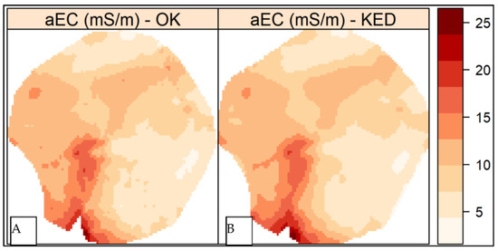 (A) shows the apparent electrical conductivity maps by ordinary kriging (KO) and (B) external drift kriging (KED). aEC: apparent electrical conductivity in mS/m (millisiemens per meter).