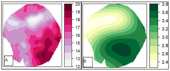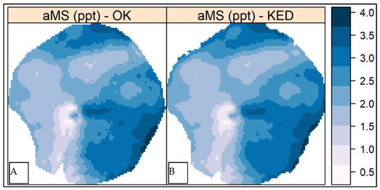The aMS maps shown in Figure 8 presented a distribution inversely proportional to the distribution of the concentration values of the aEC maps (Figure 7). In addition, the OK mapping methods of the aMS (Figure 8A) and KED (Figure 8B) data showed similar distribution patterns for the entire study area.