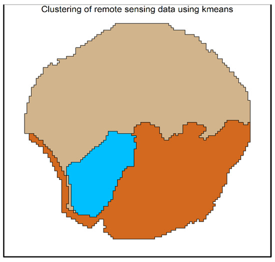 The kmeans function in the stats package presented natively in the R software [45] was used. The algorithm chosen within this function used the calculation of Hartigan and Wong (1979) [58]. The three datasets (PSS; PSS + RS; RS) were organized in a data matrix format and grouped using the k-means method. This method partitioned the dataset into k groups. The sum of the distance for the centers of the designated clusters was minimized. In the present study, three zones were chosen for k since many zones would not be operationally practical for the farmers. The k-means clustering algorithm aims to partition n observations into k clusters, where each observation will belong to a cluster with the average value closest to each other. The centers are in the mean of their sets of Voronoi polygons, which are the sets of points closest to each cluster’s center. The value “1” was set to reproduce the same arrangement using the function set.seed present in the stats package in the R software [45].