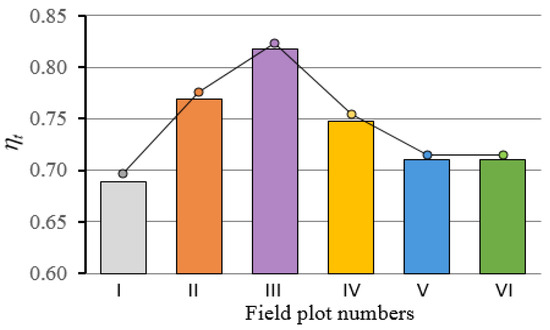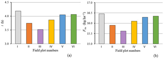 In the ploughing process, ploughing time efficiency can be described as the ratio of the time spent productively ploughing to the continuous field time the tractor spends in that field [15]. In the ASAE standard, the continuous time a machine spends in the field from the start of the operation to the end of the operation is called field time [27]. Therefore, according to the standard [27], the field time of a ploughing operation is the period that the tractor spends in the field from the beginning of the ploughing operation to the end of the ploughing operation. To calculate the efficiency of the ploughing time of the test plots, the following equation of the relationship between productive ploughing time and field time was used [15,28]: