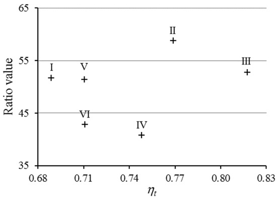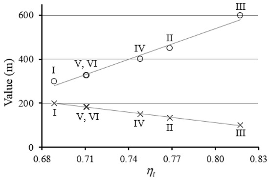 The ratio of the average length of the plot in the direction of ploughing and the maximum width of the plot, perpendicular to the ploughing, with the efficiency factor of field ploughing time: o is the average length of the plot in the direction of ploughing, and × is the maximum width of the plot, perpendicular to the ploughing: (I) 200 m wide, irregular quadrangular shape; (II) 133.3 m wide, rectangular shape; (III) 100 m wide, rectangular shape; (IV) 200 m wide, irregular quadrangular shape; (V) 183.3 m wide, rectangular shape; (VI) 50 m wide, irregular hexagonal shape.