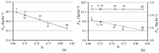 Tractor fuel consumption when ploughing field plots of different shapes and dimensions, according to the field ploughing time efficiency coefficient: (a) ο is the total field fuel consumption; (b) × is the fuel consumption during productive ploughing; + is the fuel consumption during non-productive activities (on the secondary axis); (I) 200 m wide, irregular quadrangular shape; (II) 133.3 m wide, rectangular shape; (III) 100 m wide, rectangular shape; (IV) 200 m wide, irregular quadrangular shape; (V) 183.3 m wide, rectangular shape; (VI) 50 m wide, irregular hexagonal shape.