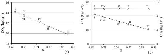 Dependence of CO2 emissions per hectare on the field ploughing time efficiency coefficient when ploughing field plots of different shapes and dimensions: (a) ο is total field CO2 emissions; (b) × is the CO2 emissions during productive ploughing; + is CO2 emissions during non-productive activities (on the secondary axis); (I) 200 m wide, irregular quadrangular shape; (II) 133.3 m wide, rectangular shape; (III) 100 m wide, rectangular shape; (IV) 200 m wide, irregular quadrangular shape; (V) 183.3 m wide, rectangular shape; (VI) 50 m wide, irregular hexagonal shape.