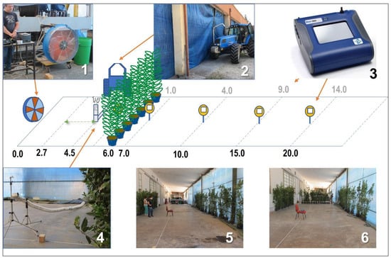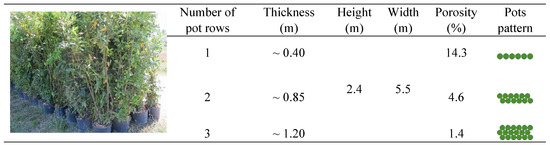 The green barrier was made by placing the plants in containers (0.25 m in diameter) side by side to form one, two, or three rows of plants, in order to obtain hedges of different thicknesses and densities (Figure 2). The hedges were placed at 6.0 m from the fan.