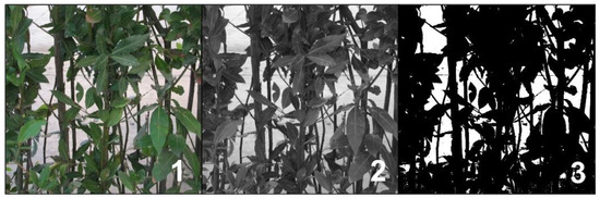 The optical porosity of the hedge was the parameter chosen to describe its density. This was determined through the analysis of digital images processed with ImageJ software, version 1.53e (Figure 3) [32].