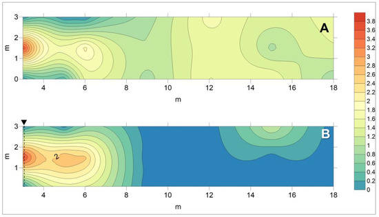 The air velocity inside the wind tunnel sampling area was measured downwind of the hedge, where the average wind speed (measured at a height of 0.7 m from the ground) along the test area was 1.2 m s−1 in the absence of the hedge and 0.5 m s−1 with the hedge. No substantial differences in average wind velocity were recorded with the hedge formed by one, two, or three rows of plants. The obtained pattern of the air flow is shown in Figure 4, where it is compared the air pattern velocity in the sampling area without plants and with a hedge formed by three rows of pots. The plants induced an average reduction in wind speed, which decreased to zero after approximately 9 m from the hedge. However, around 15 m from the hedge, a slight increase in air velocity was observable (Figure 4B).