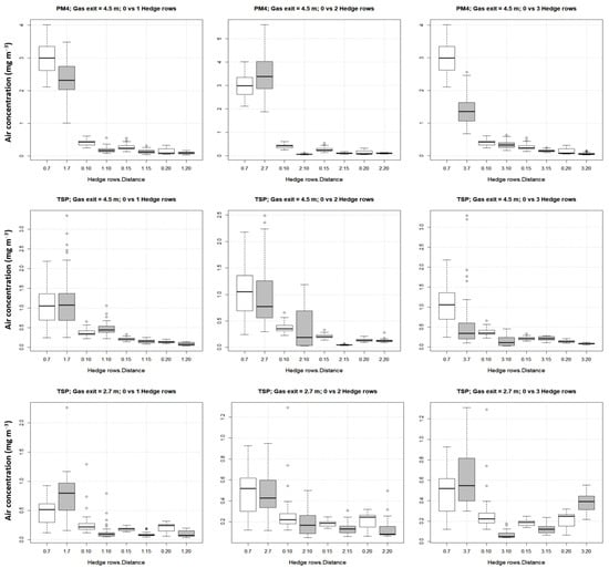 Comparison between the values of PM4 and TSP concentrations in the test area, with and without hedges, by the distance. The codes on the horizontal axis show the number of hedge rows and the distances in meters (line within box: median; box limits: 25th and 75th percentiles; whisker ends: minimum and maximum; empty circles: outliers).