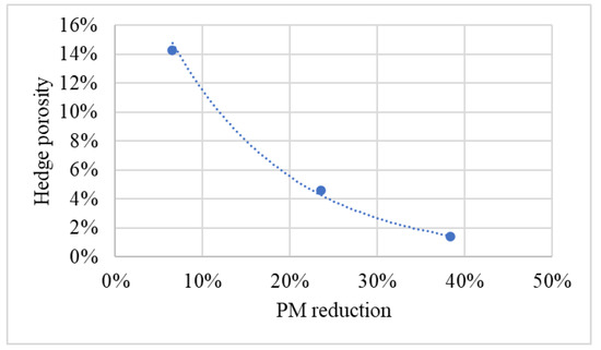 The observed values of overall dust concentration reduction were strictly correlated with the edge porosity (showed in Table 2) in only one test, specifically in the case of TSP assessment with the fan placed at 4.5 m from the exhaust gas exit (Figure 6). In the case of PM4, a relation was not observed because the reduction values were similar with each hedge.