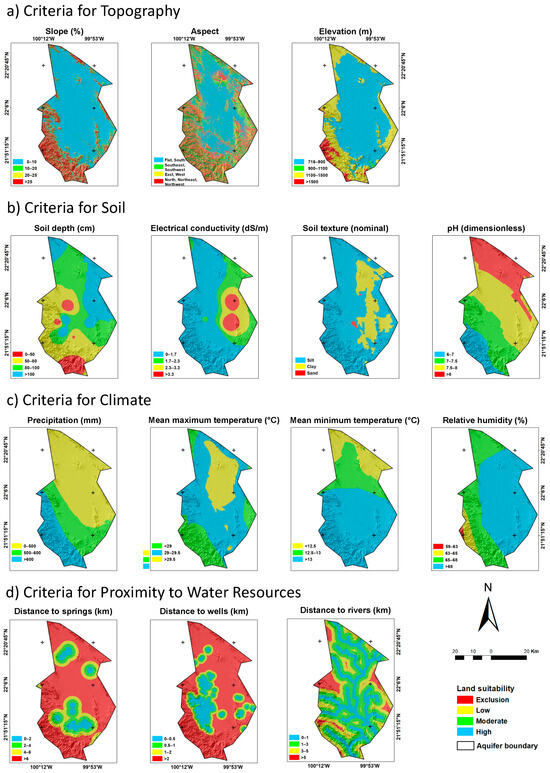 The spatial datasets used for carrying out the land suitability analysis for growing orange groves in the Rioverde region are presented in Figure 2. We built four main criteria using 14 subcriteria. The main criteria were as follows: topography, soil, climate, and proximity to water sources. The topography criterion comprised three subcriteria, including elevation, slope and aspect. The soil criterion consisted of the subcriteria pH, soil depth, electrical conductivity, and soil texture. The climate criteria were built with relative humidity, precipitation, mean minimum temperature, and mean maximum temperature. The proximity to water sources criterion collected the spatial variability in the distance to rivers and streams, distance to springs and distance to wells.