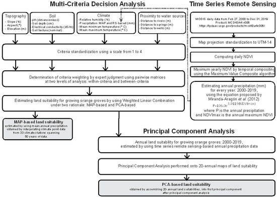 This study aimed to delineate the most suitable areas for sustainable citrus production by integrating multi-criteria decision analysis, time-series remote sensing, and principal component analysis in a portion of the northern citrus belt of Mexico, particularly in the Rioverde Valley. Fourteen specific factors were grouped into four main factors, i.e., topography, soil, climate, and proximity to water sources, to carry out a multi-criteria decision analysis for classifying production areas according to suitability levels. To explore the effect of precipitation on land suitability for citrus production, we analyzed the historical record of annual precipitation estimated by processing 20-year NDVI daily data. The multi-criteria model was run for every precipitation year. The final map of land suitability was obtained by using the first component after principal component analysis on annual land suitability maps. The results indicate that approximately 30% of the study area is suitable for growing orange groves, with specific areas designated as suitable based on both mean annual precipitation (MAP) and principal component analysis (PCA) criteria, resulting in 84,415.7 ha and 95,485.5 ha of suitable land, respectively. The study highlighted the importance of remotely sensed data-based time-series precipitation in predicting potential land suitability for growing orange groves in semiarid lands. Our results may support decision-making processes for the effective land management of orange groves in the Mexico’s Rioverde region.