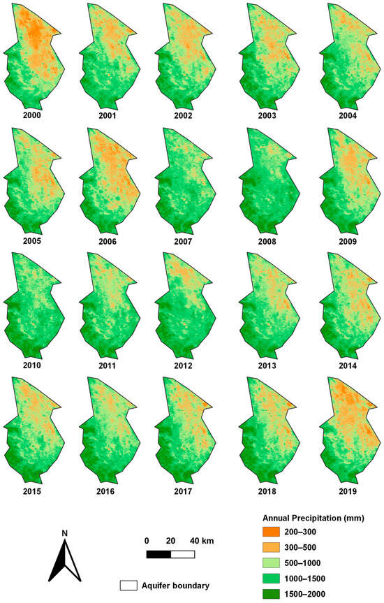 Figure 4 shows the estimated precipitation pattern in the study area, bounded by the limit of the aquifer, for the years 2000–2019 computed by using the temporal composite of maximum annual NDVI, built with daily remotely sensed data. When analyzing Figure 4, two temporal patterns can be seen. The first pattern can be considered from 2000 to 2006, while the second pattern can be seen from 2011 to 2019. The years 2007, 2008 and 2010 were wetter years, although 2009 was a drier year. In general, mostly the northern and middle regions of the study area, with a spatial pattern from northwest to east-central, have been mostly affected by water shortages, experiencing precipitation lower than 500 mm.
