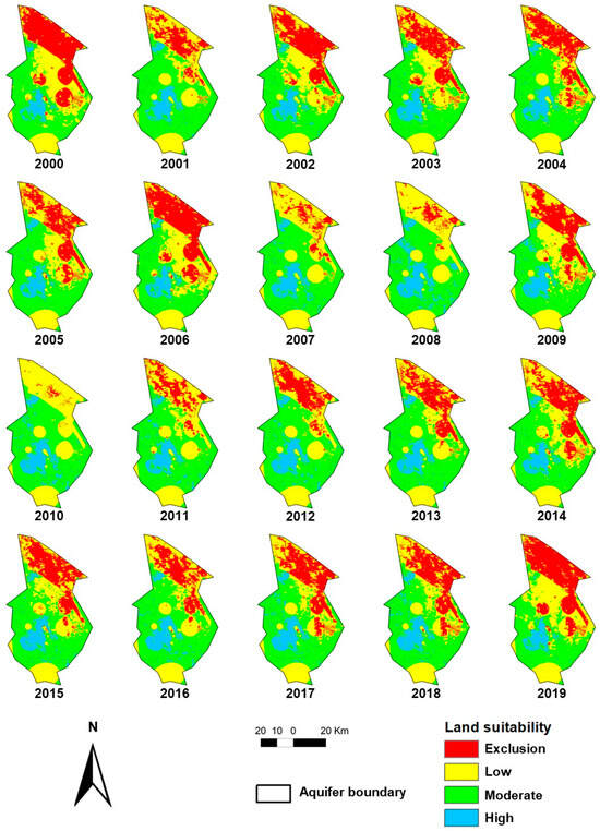 This study utilized time-series remote sensing data to estimate annual precipitation, allowing us to evaluate the suitability of land for orange grove cultivation on an annual basis. This approach provided a spatiotemporal perspective of the Rioverde region and revealed the variation in land suitability over time. Notably, our results indicate that the northern portion of the study area is particularly sensitive to climate variation, particularly interannual rainfall variation. On the other hand, a noticeable condition in Figure 5 can also be perceived: the middle and southern parts of the study area show high stability of the spatial pattern of land suitability for orange groves. Both conditions demonstrate that the temporal pattern of land suitability in the Rioverde aquifer, our study area, exhibits strong variation; in specific areas, however, this pattern is relatively homogeneous over time.