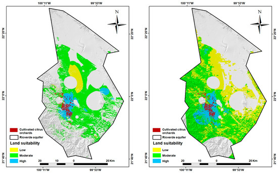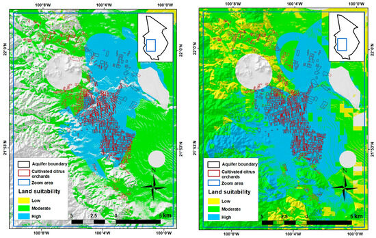 Zoom-in to cultivated citrus orchards for validating estimated land suitability: MAP-based land suitability (left) and PCA-based land suitability (right).