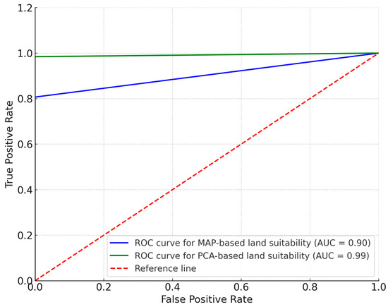 Area under the curve for MAP-based and PCA-based land suitability multi-criteria decision models.