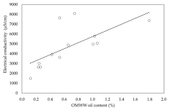 Relation between electrical conductivity (µS/cm) and oil content in OMWW (%).